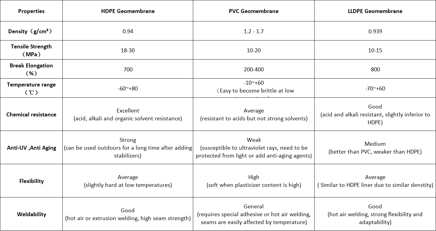 With so many outstanding properties : High Strength- Super Low Impermeability -Great Chemical resistance , geomembrane is widely used on environmental and anti-seepage engineering .such as environmental protection , water conservancy projects , municipal engineering , landscaping engineering ,petrochemical industry . But maybe you don’t know there are 3 types of them: HDPE liner , LLDPE liners , PVC liners. HDPE geomembrane is the most popular type. HDPE, PVC and LLDPE geomembranes are all commonly used as liners in anti-seepage engineering projects , However, they differ significantly in terms of raw material properties, performance parameters, and applicable scenarios.